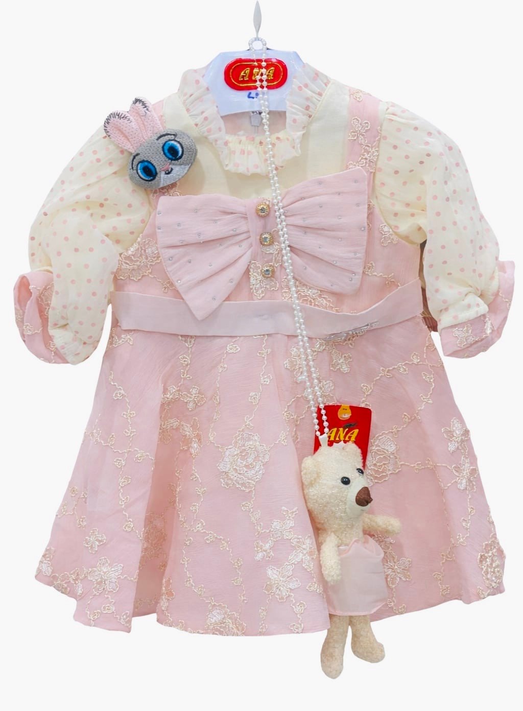 Dress your little princess in sweet elegance with this adorable pink baby girl dress. Featuring soft sheer sleeves, delicate lace detailing, and a charming front bow, this dress is perfect for birthdays, parties, and special occasions. Made with lightweight, comfortable fabric to keep your baby happy all day long — cute, classy, and picture-perfect
